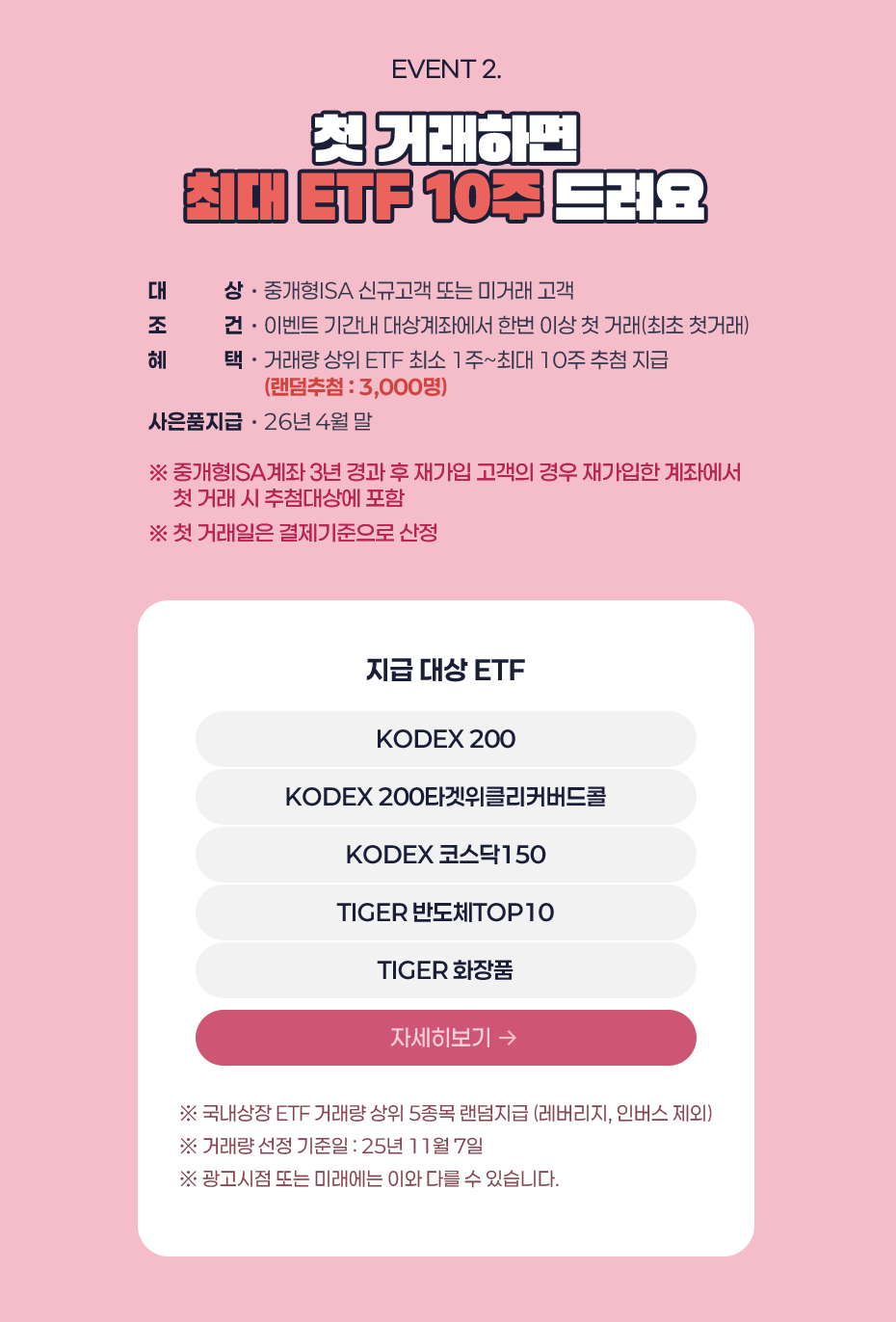 | 첫 거래 ETF 지급 | 신규·미거래 고객 | 이벤트 기간 내 첫 거래 | ETF 1~10주(추첨) |